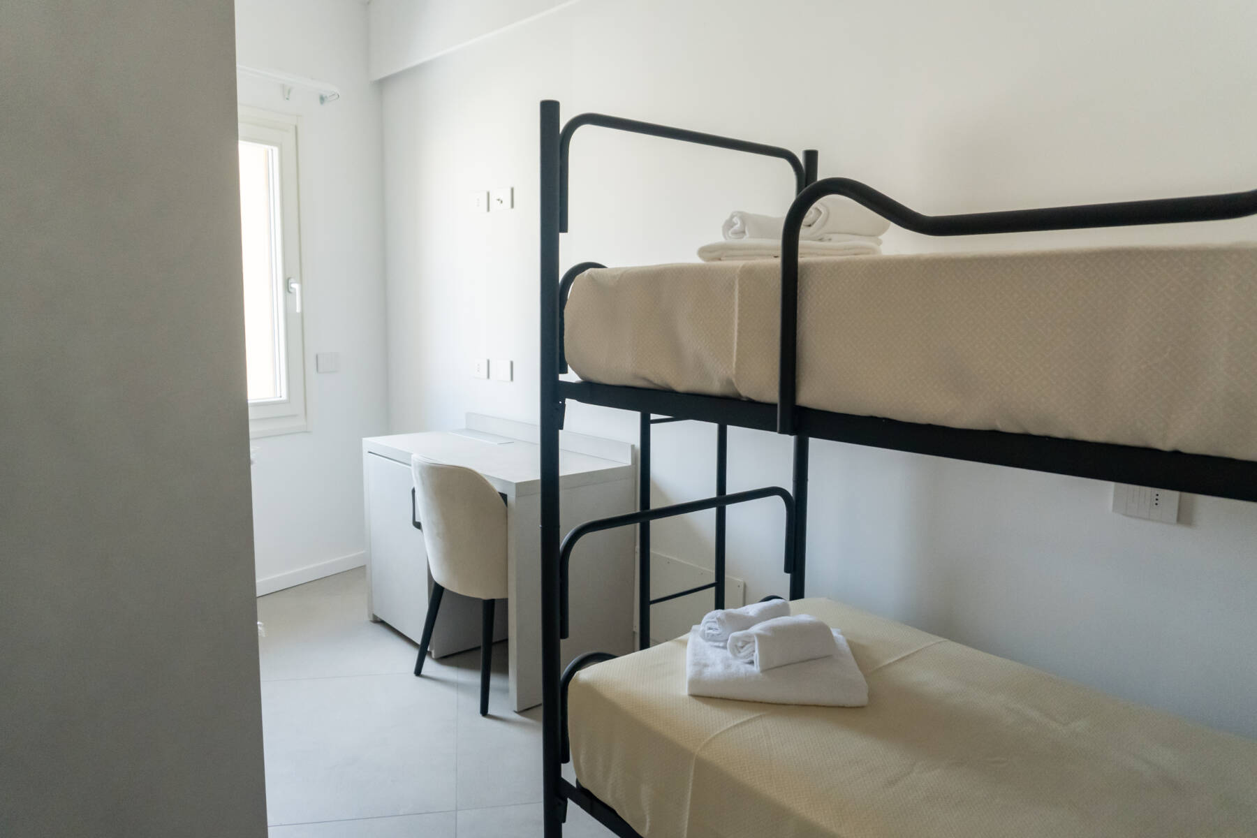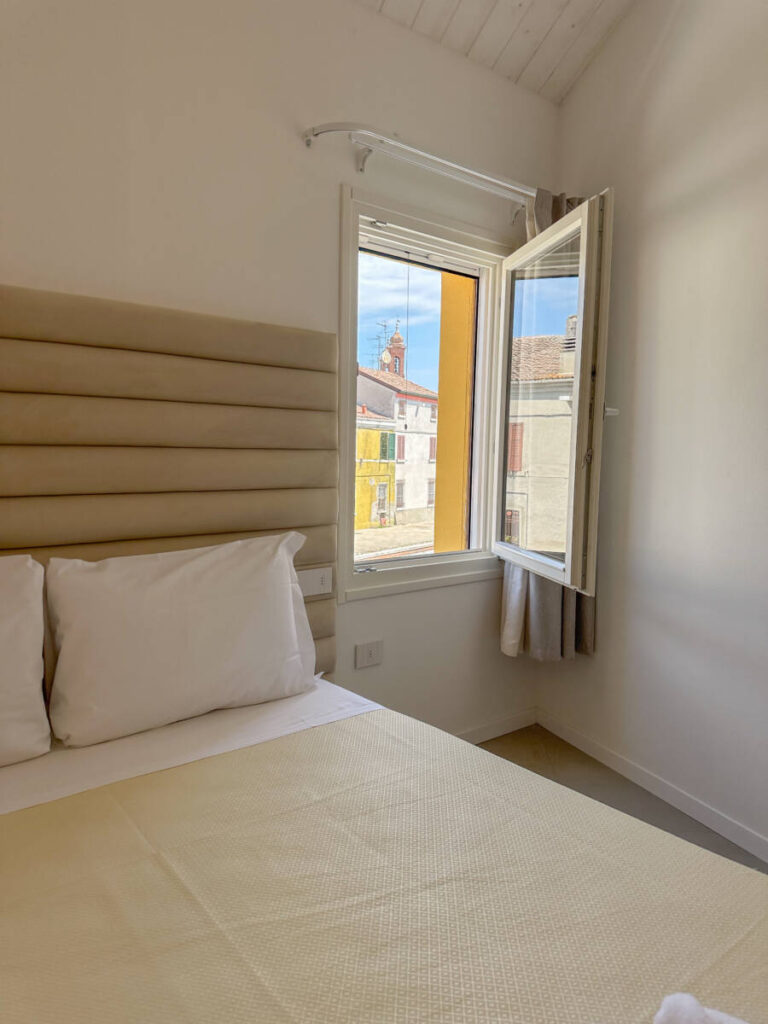 La camera quadrupla vista canale della Locandina è un rifugio intimo e confortevole, perfetto per famiglie in cerca di relax e tranquillità. Arredata con eleganza e attenzione ai dettagli. La stanza presenta due ambienti: il primo con un letto matrimoniale e il secondo con un letto a castello.